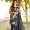 The suit typically includes plain black or solid yellow bottoms (trousers, pants, or shalwar) that match the colors in the print to complete the look.