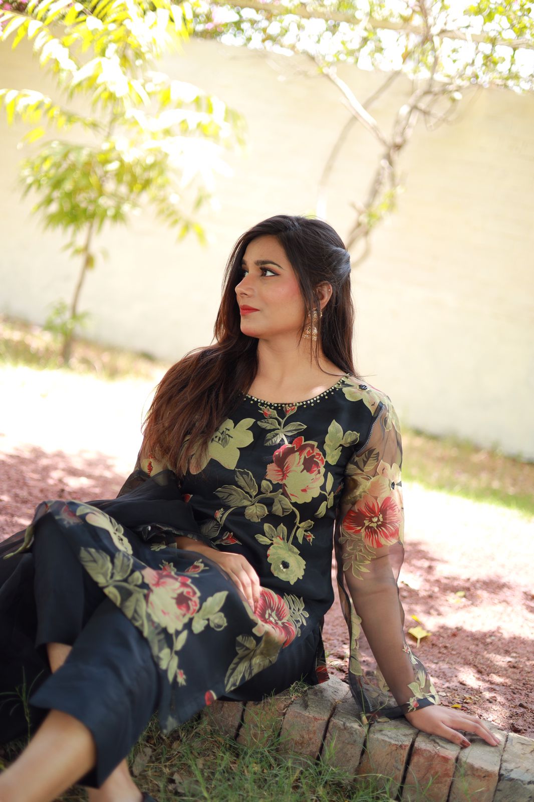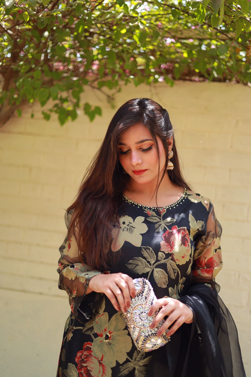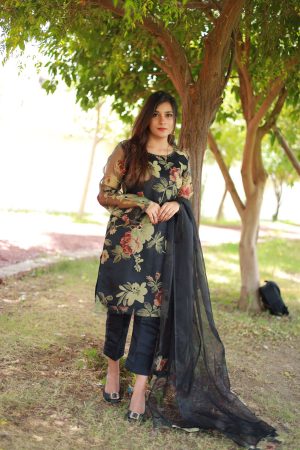 Sheer Black Floral Printed Organza Suit with Beaded Neckline